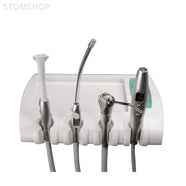 Appollo I – современная и доступная стоматологическая установка с верхней подачей инструментов и несколькими цветами мягкой обивки на выбор.
