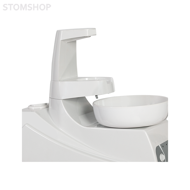 Гидроблок со съемной керамической плевательницей. Поворачивается на 60º, управляется с ножной педали. Плевательница со сливом и фильтром для удержания твердых частиц. Прозрачная емкость на 1000мл в нижней части гидроблока для снабжения инструментов дистиллированной водой.