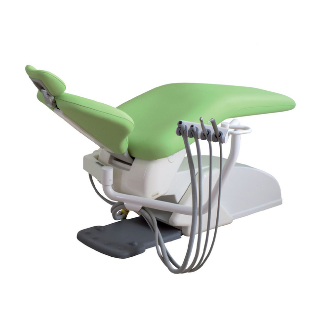 Стоматологическое кресло Moon с широкой спинкой Swan и мягкой обивкой Supermemory. В передней части кресла (под ногами пациента) под кожухом размещается блок подвода электропитания, сжатого воздуха, воды, аспирации, канализации. Кресло может управляться со спинки, с модуля ассистента или с помощью многофункциональной педали.