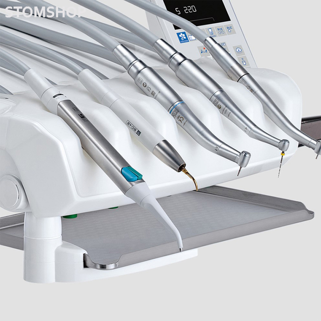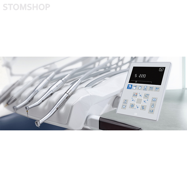 Турбины наконечников оснащены скоростным встроенным фитингом. Консоль врача оснащена дисплеем LED для определения скорости инструментов. Негатоскоп для просмотра интраоральных рентгенограмм. Модуль MIDWEST, 4-х канальный для фиброоптики модуль с бесщеточный микромотором STERN WEBER i-XR3 L (1000-40 000 об/мин. / 3 Н/см) с фиброоптикой модуль с 6-функциональным пистолетом вода/воздух.