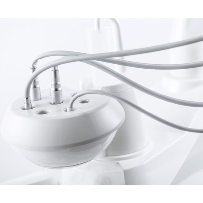 На шарнирном и автоматически уравновешивающемся плече, с амплитудой вертикального перемещения 34 см, дросселирующий, с пневмосистемой вертикального замка. Со съемным и автоклавируемым силиконовым ковриком. Съемный поднос стальной для размещения двух стандартных лотков. Подходит для размещения до 5 инструментов. Каждый инструмент оснащен системой защиты от попадания жидкости в гидросхему внутри установки, автоматической системой подачи воздуха: Chip air, независимой системой регулировки подачи воды для спреев, системой подачи воздуха и воды: Chip air/Chip water.