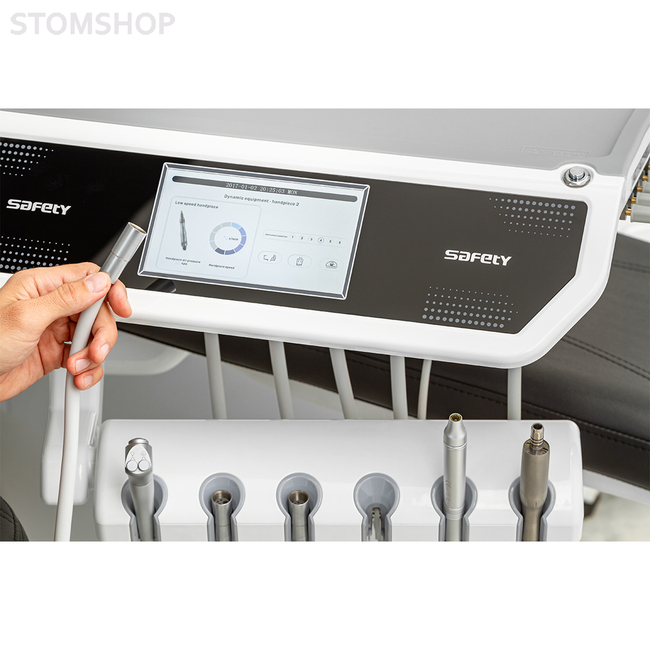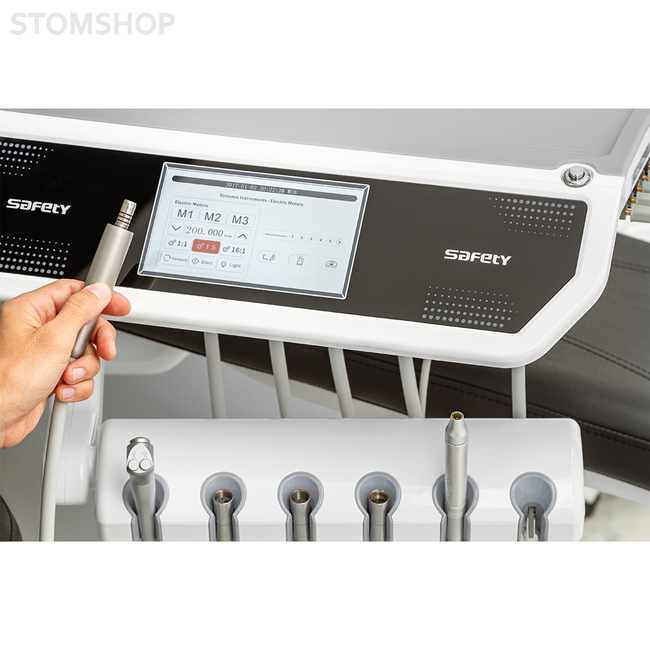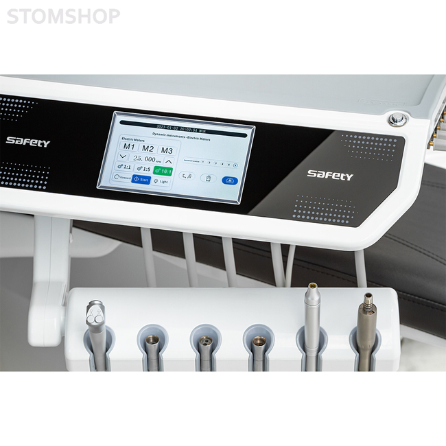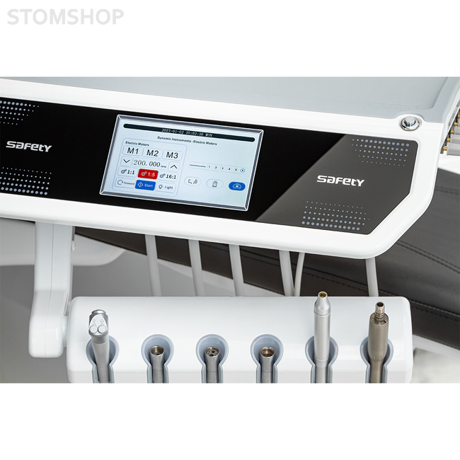 Safety M8 Down – это современная стоматологическая установка с нижней подачей инструментов, освещением на 8 диодов, сенсорным модулем врача, а также встроенным микромотором и скейлером.