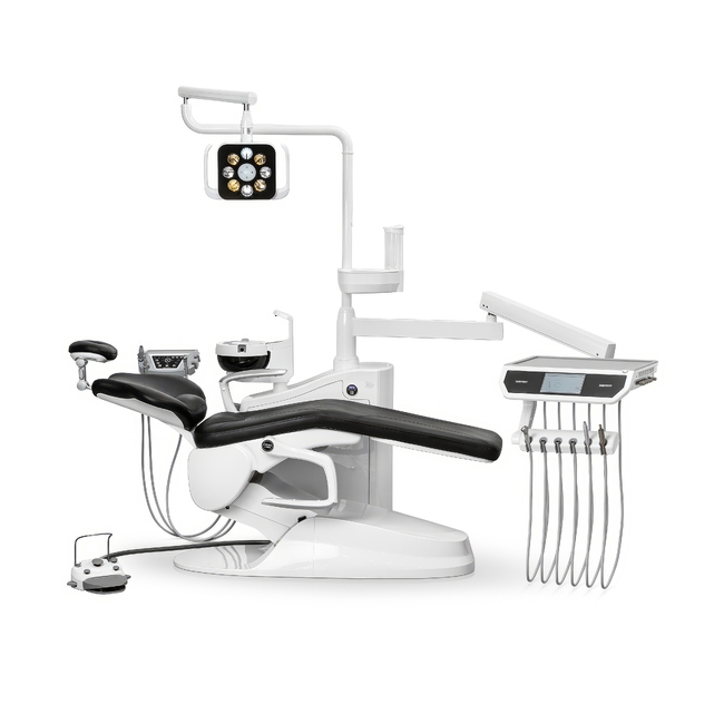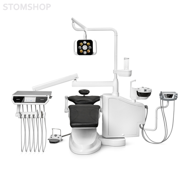 Встроенный мощный светодиодный светильник с 8 диодами и освещением до 50 000 люкс, модуль фиброоптики (шланг + плата), поворотная керамическая плевательница и автоматический подогрев воды для инструментов делают эту установку современным и функциональным решением.