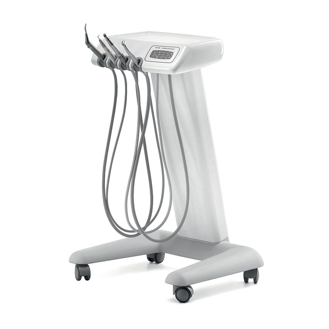 TEMPO ELX KART - подкатной модуль врача, мобильная стоматологическая установка на отдельной стойке на колесиках. Нижняя подача, 4 инструмента с прямыми шлангами. Пленочная клавиатура позволяет управлять функциями кресла, включением/выключением подсветки, реверсом микромотора, наполнением стакана и смывом плевательницы, регуляторами воды спрея, рабочего воздуха и воздуха спрея для каждого инструмента.