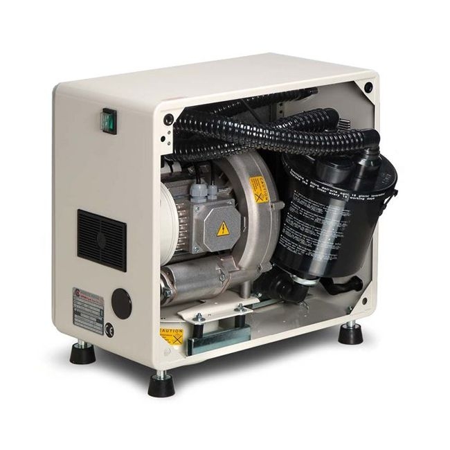 Помещен в шумозащитный кожух с закругленными углами, оснащен бесшумным индукционным мотором с защитой от перегрева, электронным датчиком уровня жидкости в канистре - сепараторе и защитой от переполнения, автоматической системой слива аспирата из канистры в дренажную систему с помощью откачивающей помпы. Аспирационный воздух выходит наружу через глушитель.