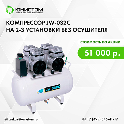 Воздушный безмасляный стоматологический компрессор JW-032C в кожухе предназначен для 3 стоматологических установок, работает за счет самосмазывающегося материала. Самосмазывающийся материал относится к полимеру с низким коэффициентом трения. Безмасляный компрессор имеет больше преимуществ по сравнению с масляным компрессором, он обеспечивает отсутствие масла в рабочей среде, не создает привкуса, обеспечивает санитарные условия работы и чистоту.