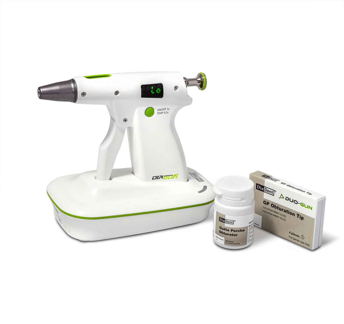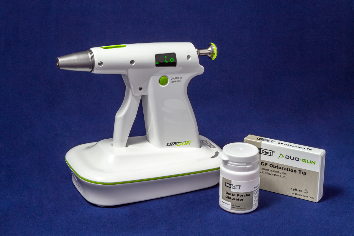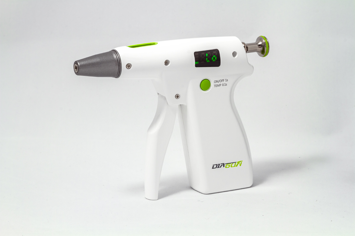 Dia-GUN - эндодонтический беспроводной прибор, который нагревает специально разработанную гуттаперчу до состояния высокой текучести и позволяет ввести ее через специальную канюлю в корневой канал, надежно обтурируя его.