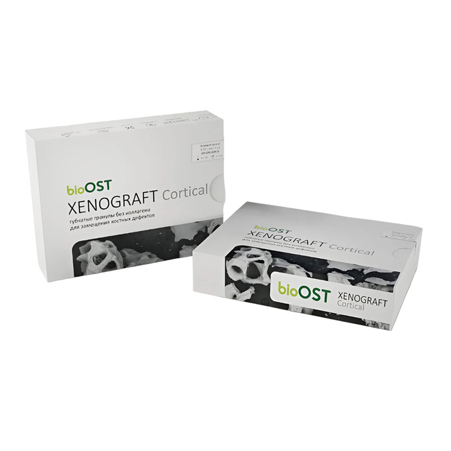 bioOST XENOGRAFT Cortical – кортикальные костные гранулы с коллагеном, размер 0.5-1.0 мм, объем 0.5 сс.