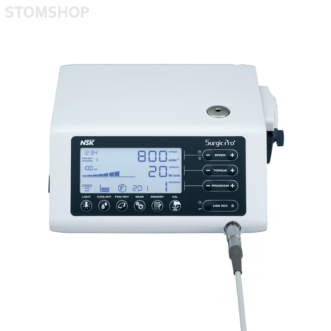 Физиодиспенсер Surgic Pro+ с блоком управления с улучшенной функцией калибровки крутящего момента под нагрузкой и без, с функцией записи данных на USB носитель (дата, скорость, направление вращения, крутящий момент, передаточное отношение, количество подаваемой жидкости).