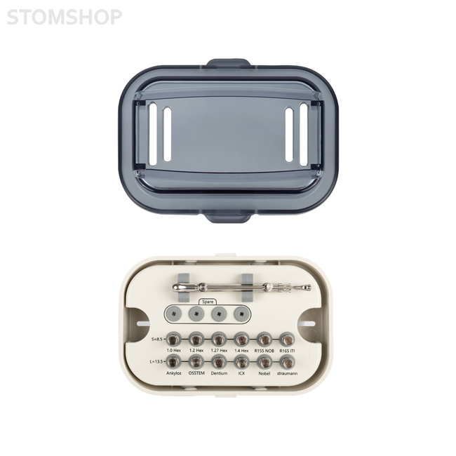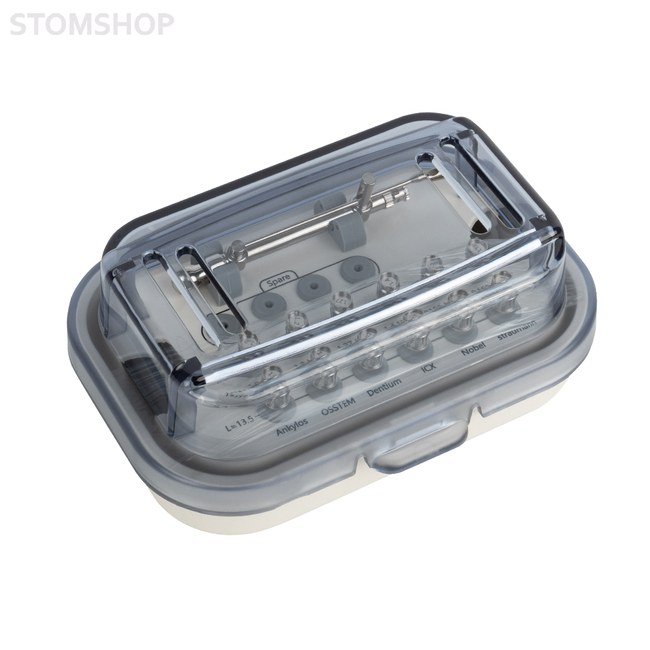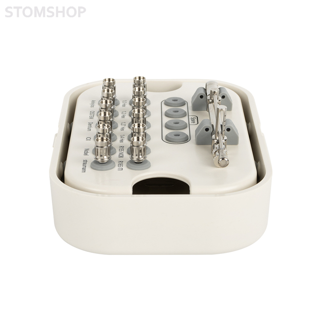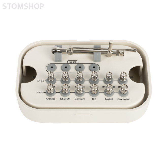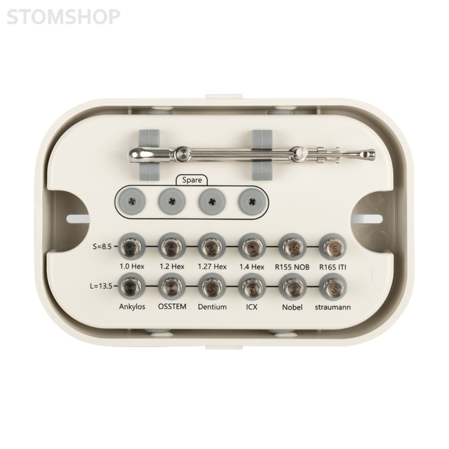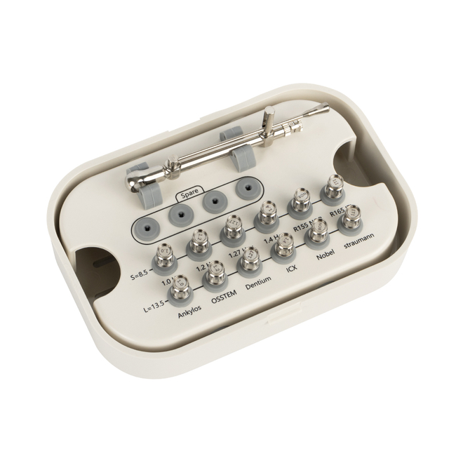 Набор отверток для фиксации и снятия винтов различных имплантационных систем. В комплекте 12 отверток, подходящих для разных систем имплантатов, динамометрический ключ и удобный кейс для стерилизации и хранения с подставкой для всех комплектующих. Универсальный комплект подойдет для большинства популярных систем имплантации и любых клинических ситуаций.