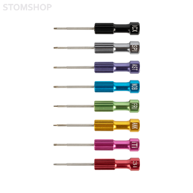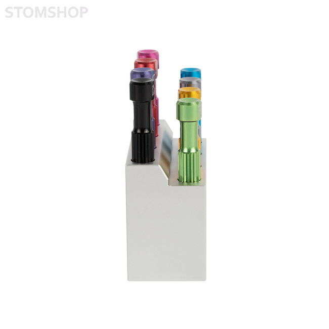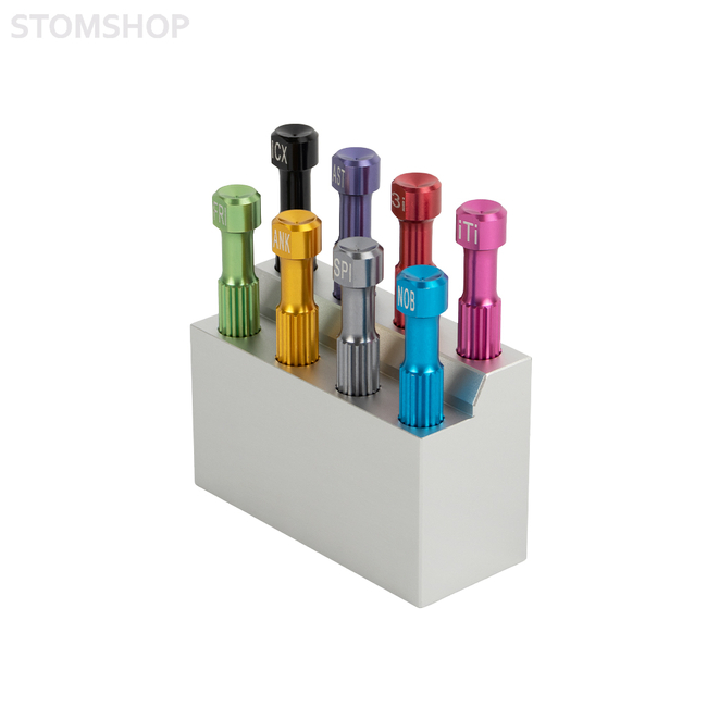 Набор компактных ручных отверток для фиксации и снятия винтов различных имплантационных систем. В комплекте 8 разных отверток, подходящих для разных систем имплантатов и удобная подставка для хранения.
