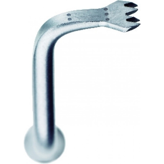 Эта насадка, предназначенная для сложных анатомических ситуаций, облегчает разрезание кортикальной кости в области ветви нижней челюсти. Изогнутая влево, она применяется для создания вертикальных и горизонтальных линий остеотомии в области ветви нижней челюсти справа. Облегчает проведение горизонтальных и вертикальных разрезов во время забора костного блока из области ветви нижней челюсти.