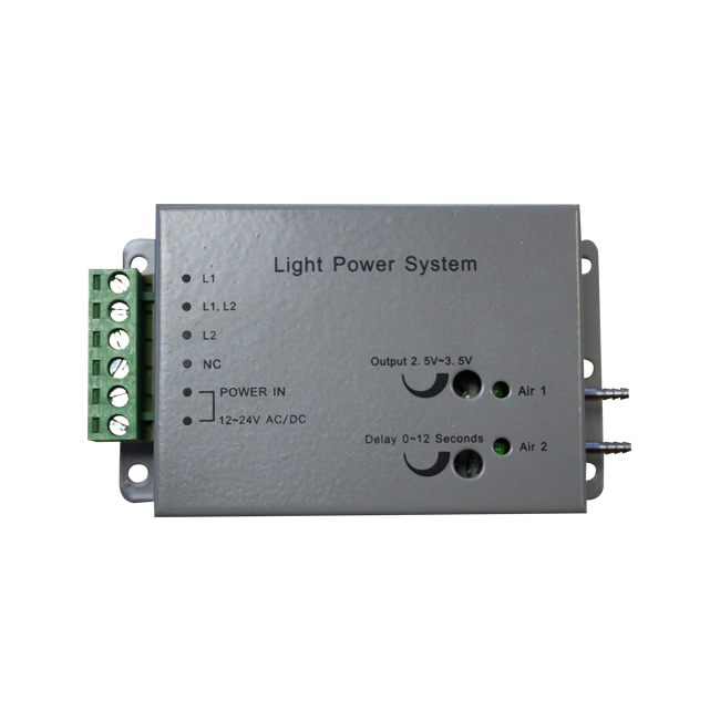 На верхней панели по каждому каналу «А» или «В» находятся два регулированных резистора по заданию величины постоянного напряжения питания для LED подсветки в пределах от 2 ÷ 4 В и величины временной задержки отключения LED подсветки в пределах от 0 ÷ 25 секунд от момента отключения подачи рабочего давления на наконечник от педали.
