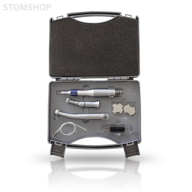 Кейс укомплектован высококачественным турбинным наконечником Mercury 311A. Турбинный тип инструмента предполагает очень высокую скорость вращения мотора, и как следствие - быструю и качественную обработку рабочей зоны. При этом наконечник отличается надежностью и долговечностью.