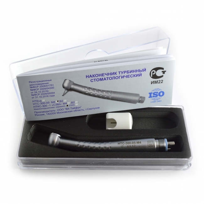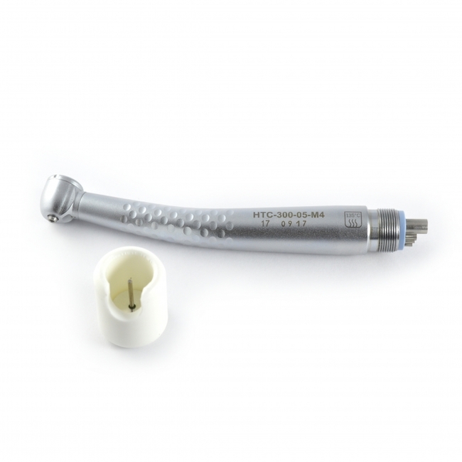 Наконечник турбинный НТС-300-05 (с фрикционным патроном для фиксации инструмента) с нормируемым в динамике радиальным биением и входящими в конструкцию специальными шарикоподшипниками, предназначен для закрепления режущих инструментов с диаметром хвостовика 1,6 мм и передачи им вращения от бормашины.