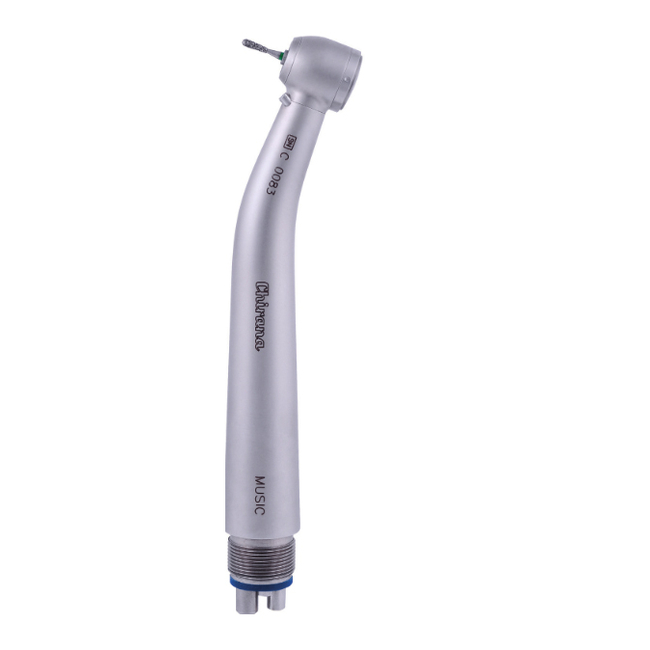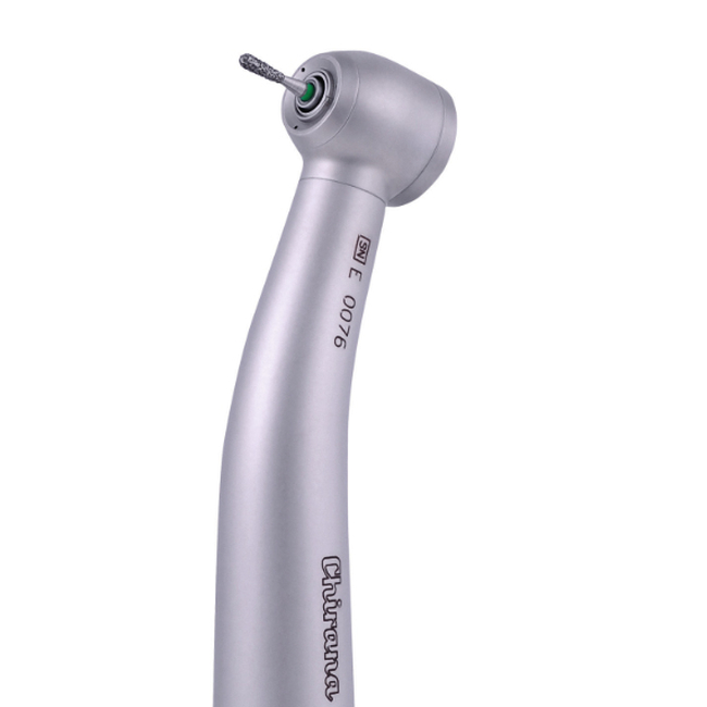 Мощный турбинный наконечник с подсветкой с гибким световодом и с кнопочным зажимом для боров, с 3-х точечной системой охлаждения препарационного инструмента.