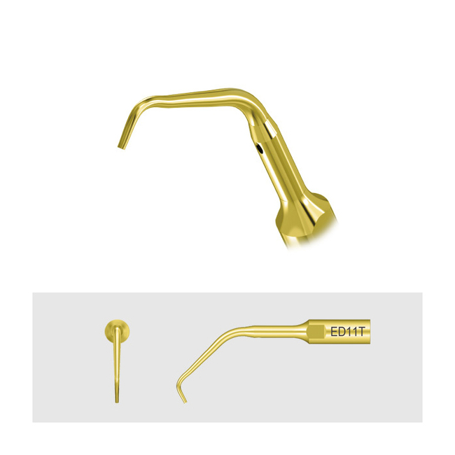 Насадка ED11T с нитрид-титановым напылением, используется при ретроградной подготовке зубных каналов. Длина части насадки малого диаметра составляет 3,5 мм.