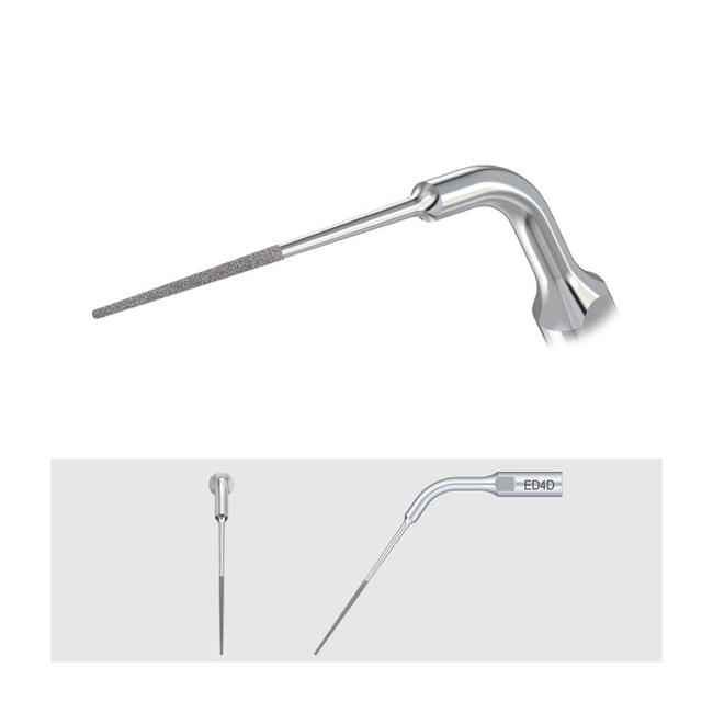 Насадка ED4D с алмазным покрытием (40 мкм) для удаления кальцифицированных фрагментов и плохо установленного пломбировочного материала в зубном канале при повторной обработке канала. Длина алмазного покрытия составляет 15 мм.