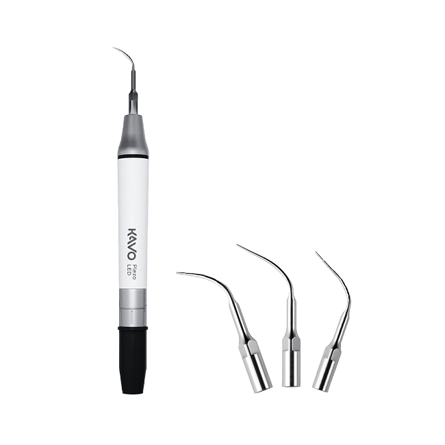 PiezoLED – набор для встраивания ультразвукового скалера в стоматологическую установку KaVo, три насадки PIEZO Scaler в комплекте. Основу комплекта составляет наконечник пьезоэлектрического скалера PiezoLED. Для управления ультразвуковым скалером используется педаль стоматологической установки.