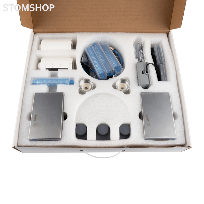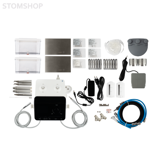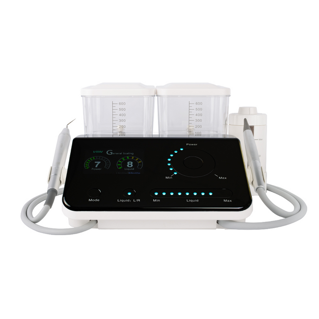 VRN Q6 – многофункциональный стоматологический аппарат с ультразвуковым, пескоструйным и порошкоструйным наконечниками. Устройство подходит для наддесневого скейлинга, удаления наддесневого и поддесневого камня, пародонтологического лечения, чистки имплантатов и лечения корневых каналов.
