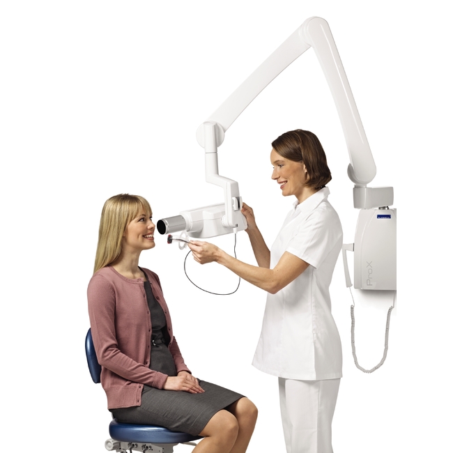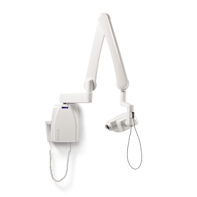 Настенный высокочастотный дентальный рентгеновский аппарат Planmeca ProX. Аппарат имеет возможность крепления радиовизиографа Planmeca ProSensor на самом рентгеновском аппарате с протяжкой кабелей внутри пантографов (Control box).