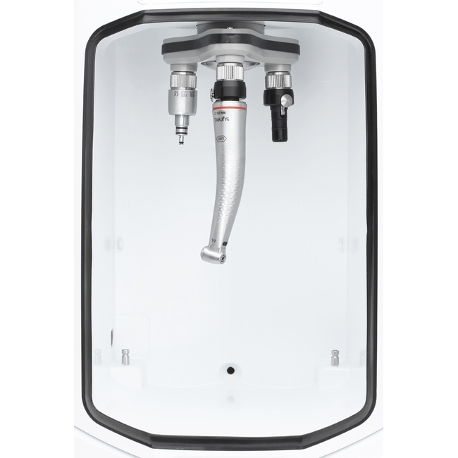 Высокопроизводительный аппарат с воздушным приводом для автоматической очистки и смазки турбинных (за исключением турбин на воздушных подшипниках), прямых и угловых наконечников, воздушных моторов, приборов для снятия зубного камня с воздушным приводом (воздушных скалеров), а также хирургических угловых и прямых наконечников производства фирмы W&H и других производителей.