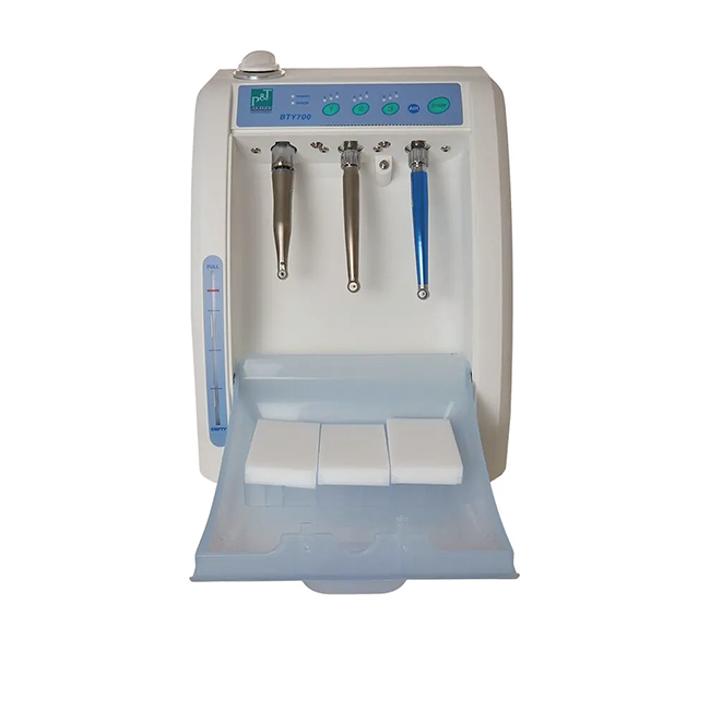 BTY-700 – аппарат для чистки и смазки стоматологических наконечников. Позволяет обрабатывать до 3 инструментов одновременно (два турбинных высокоскоростных наконечника и один низкоскоростной инструмент (мотор, прямой или угловой наконечник)).