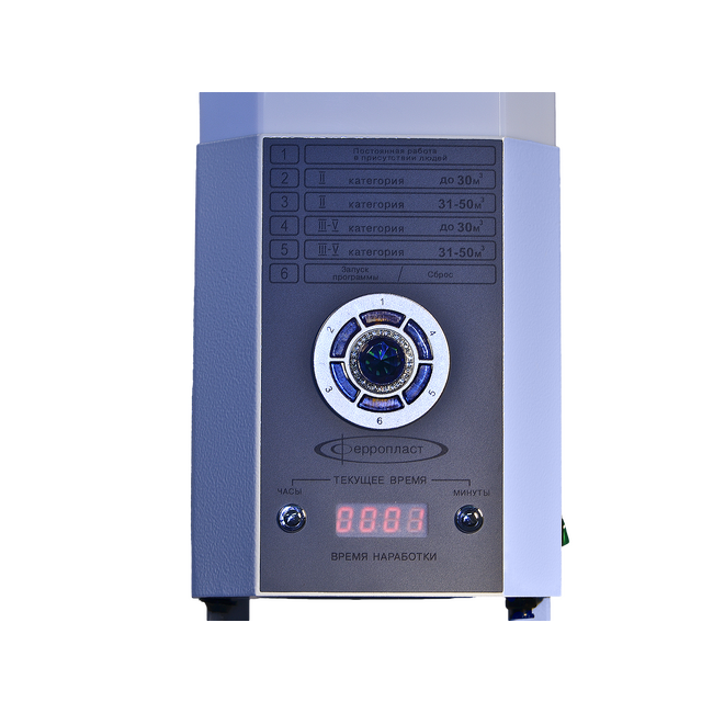 Рециркулятор имеет дисплей с цифровым отображением времени наработки ламп с точностью до 1 часа и возможностью отображения показаний текущего времени для удобства ведения журнала медперсоналом.