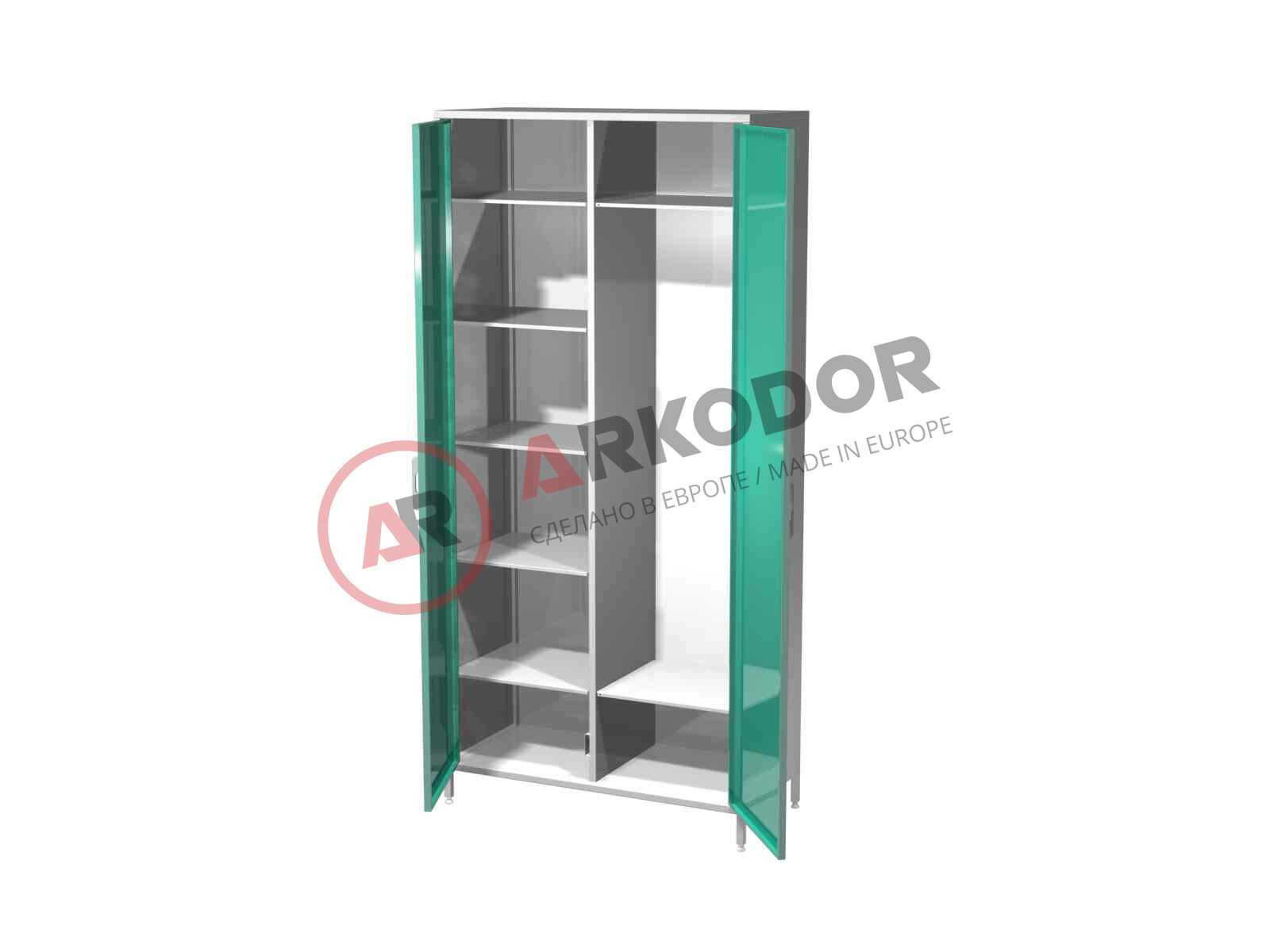 Шкаф-стеллаж AR-XC25 предназначен для хранения и дезинфекции различного инвентаря, одежды и средств, используемых в уборочных и хозяйственных целях. Шкаф оборудован замком для безопасности и защиты от несанкционированного доступа. Шкаф изготовлен из прочной стали с полимерным покрытием, устойчивым к коррозии и механическим повреждениям. Двери шкафа имеют ребра жесткости, петли на внутренней стороне и вентиляционные отверстия для обеспечения воздухообмена. Шкаф состоит из двух отсеков: левый отсек имеет две полки, правый – пять полок. Размеры шкафа составляют 1900 х 900 х 450 мм. Двери шкафа распашные, металлические. По желанию заказчика шкаф может быть дополнен штангой, крючками, зеркалом или дополнительными полками. Также возможна поставка шкафа без перегородки между нижними полками.