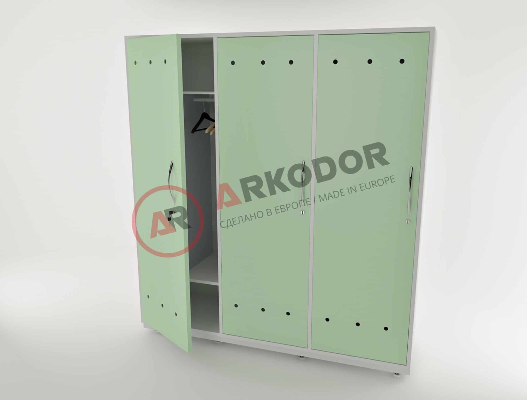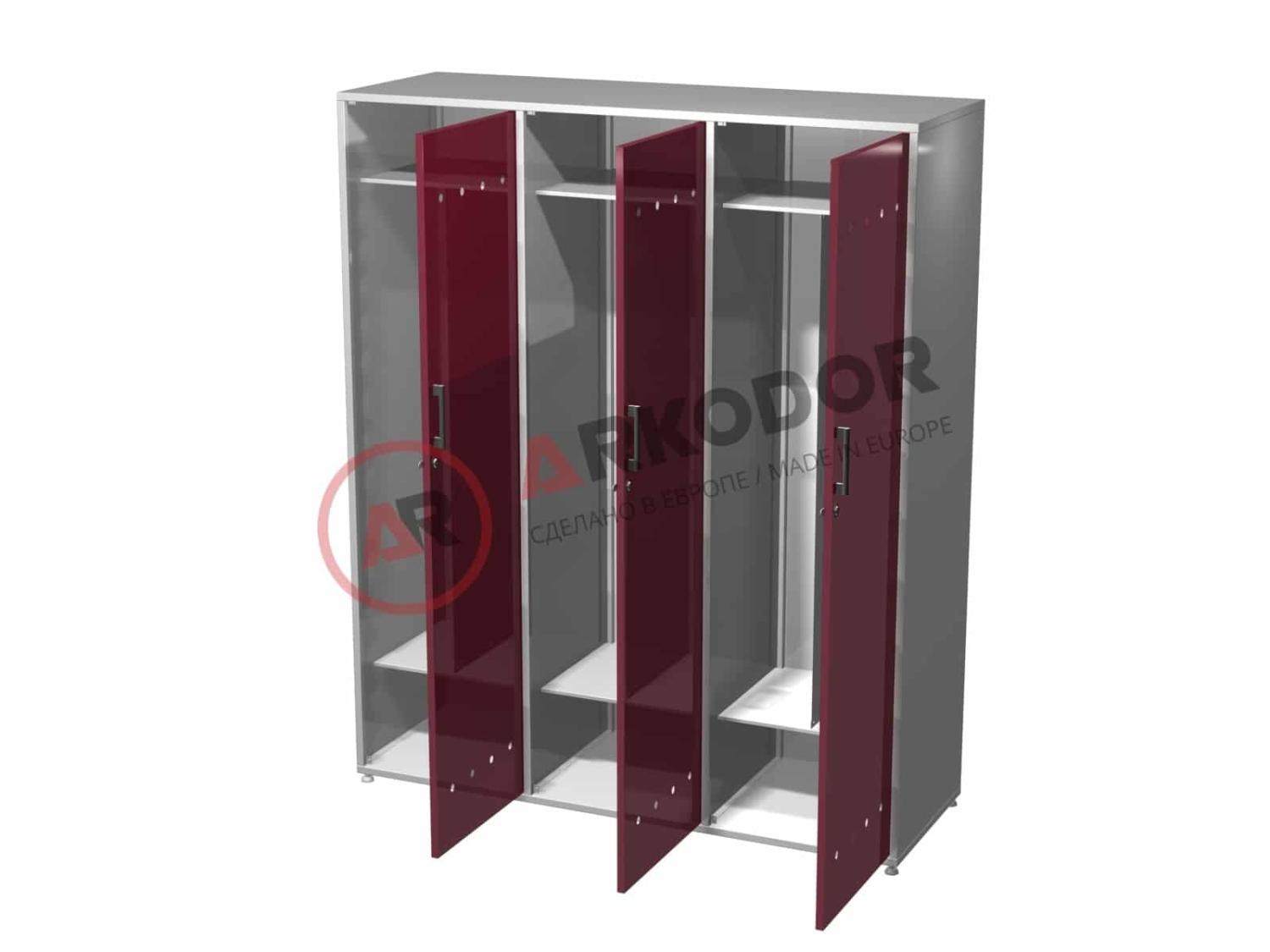 Шкаф для одежды с тремя распашными металлическими дверями, с замком, двумя металлическими полками, шторками, отделяющими рабочую одежду, в1900 х ш1350 х г550мм
