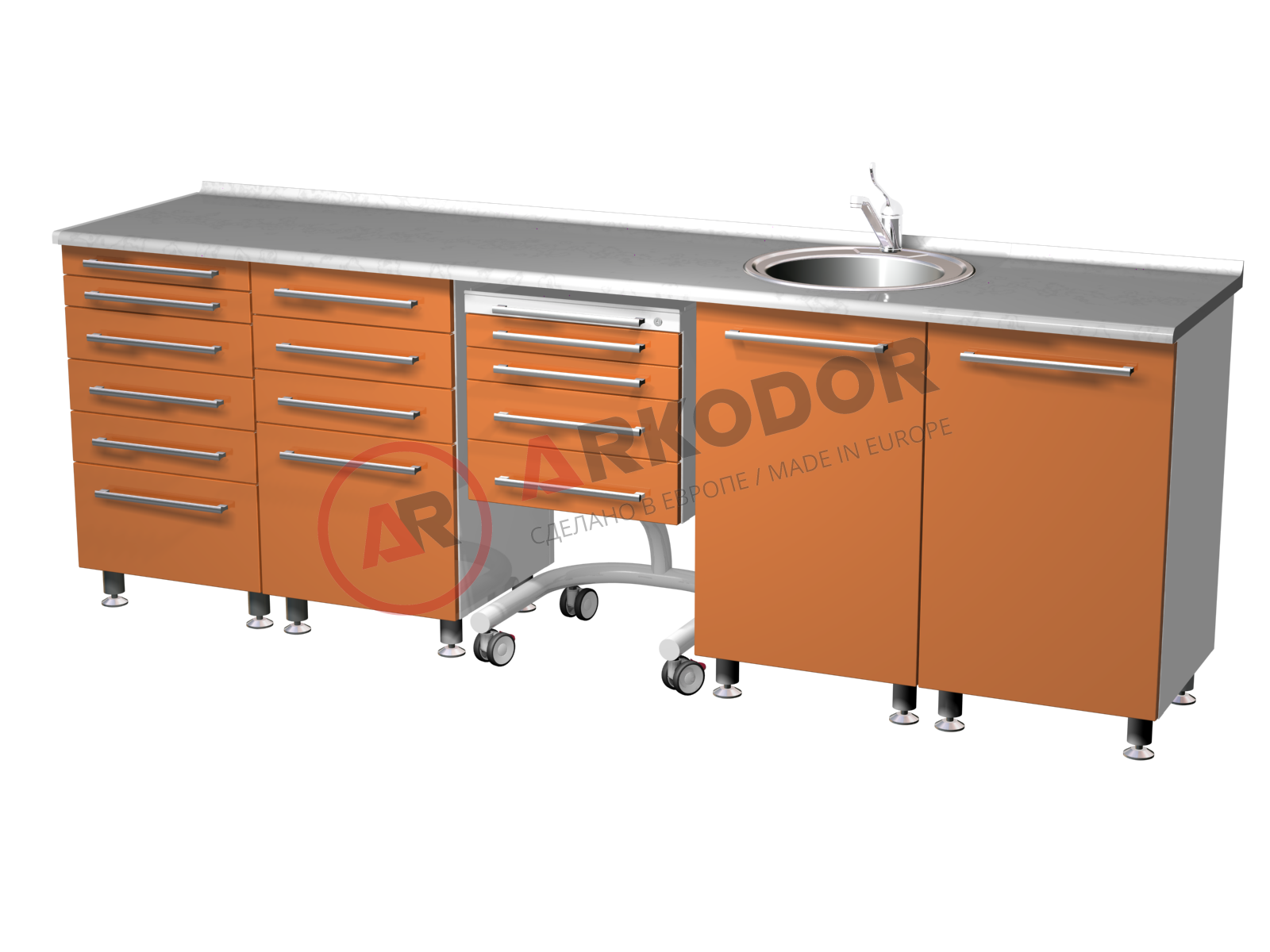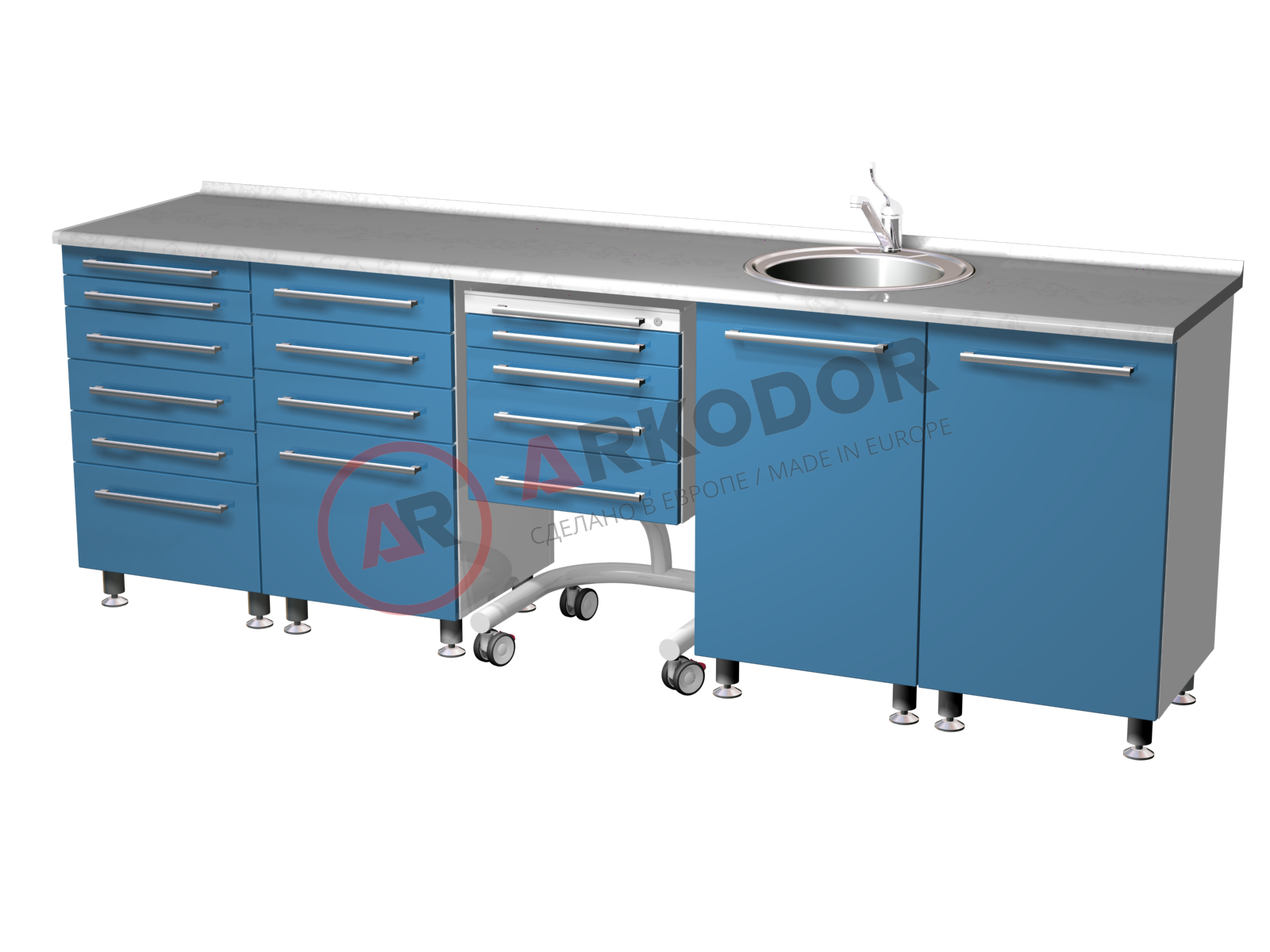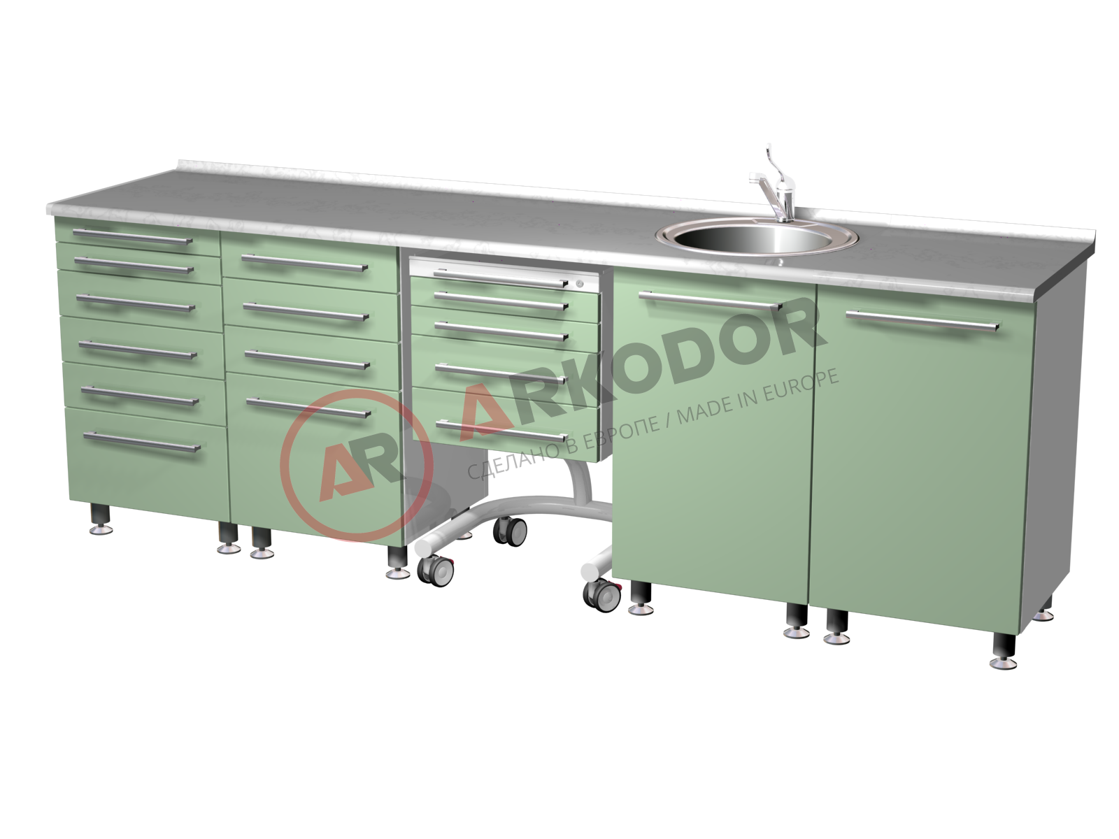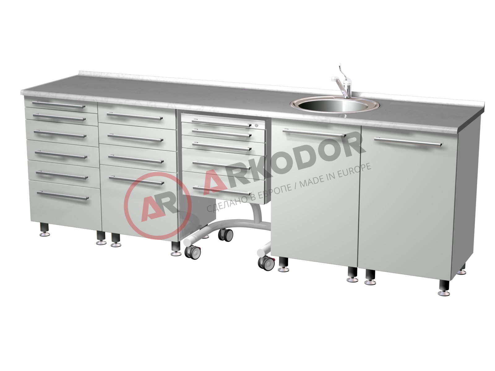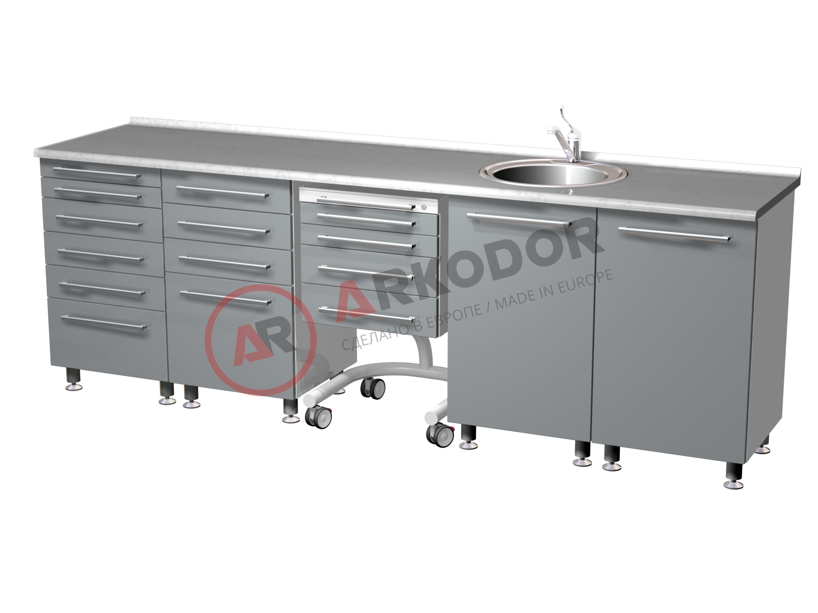 Комплект медицинской мебели ARKODENT-1 LUX состоит из пяти элементов, которые обеспечивают удобство и функциональность в стоматологическом кабинете. В комплект входят две металлические тумбы с выдвижными ящиками разного размера, которые позволяют хранить различные инструменты и расходные материалы. Также в комплекте есть передвижной столик с четырьмя ящиками, который можно легко перемещать по кабинету. Для удобства гигиены и стерилизации в комплекте предусмотрена металлическая тумба с распашной дверью, мойкой и смесителем. Наконец, в комплекте есть еще одна металлическая тумба с распашной металлической дверью и двумя полками, которая подходит для хранения крупногабаритного оборудования. Все элементы комплекта выполнены из качественного металла цвета RAL 9003 и имеют размеры в880 х ш2600 х г600 мм.