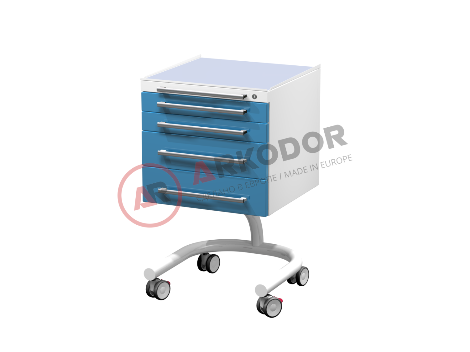 Передвижной столик с четырьмя выдвижными ящиками, сверху стекло («на круглой ноге»), в800 х ш500 х г500мм — это мобильный столик врача (ассистер) AR-34.2 LUX, который производится компанией Arkodor в Республике Беларусь . Этот столик предназначен для размещения на рабочей поверхности различных медицинских инструментов, материалов и оборудования, а также для хранения медпрепаратов, шприцов и расходных материалов в выдвижных ящиках. Столик оснащается замками, лотками, розетками и может иметь различные типы ручек, рабочей поверхности и расцветки. Столик изготавливается из стали листовой и покрывается полимерным покрытием (200 цветов), стандартный цвет белый (RAL 9003) . Верхняя крышка (столешница) из стали листовой и покрывается стеклом . Количество выдвижных ящиков — 4 . Столик имеет несущую основу на круглой ноге . Благодаря наличию больших двойных колес производства TENTE (Германия), столик удобно и легко перемещать в удобное для манипуляций расположение.