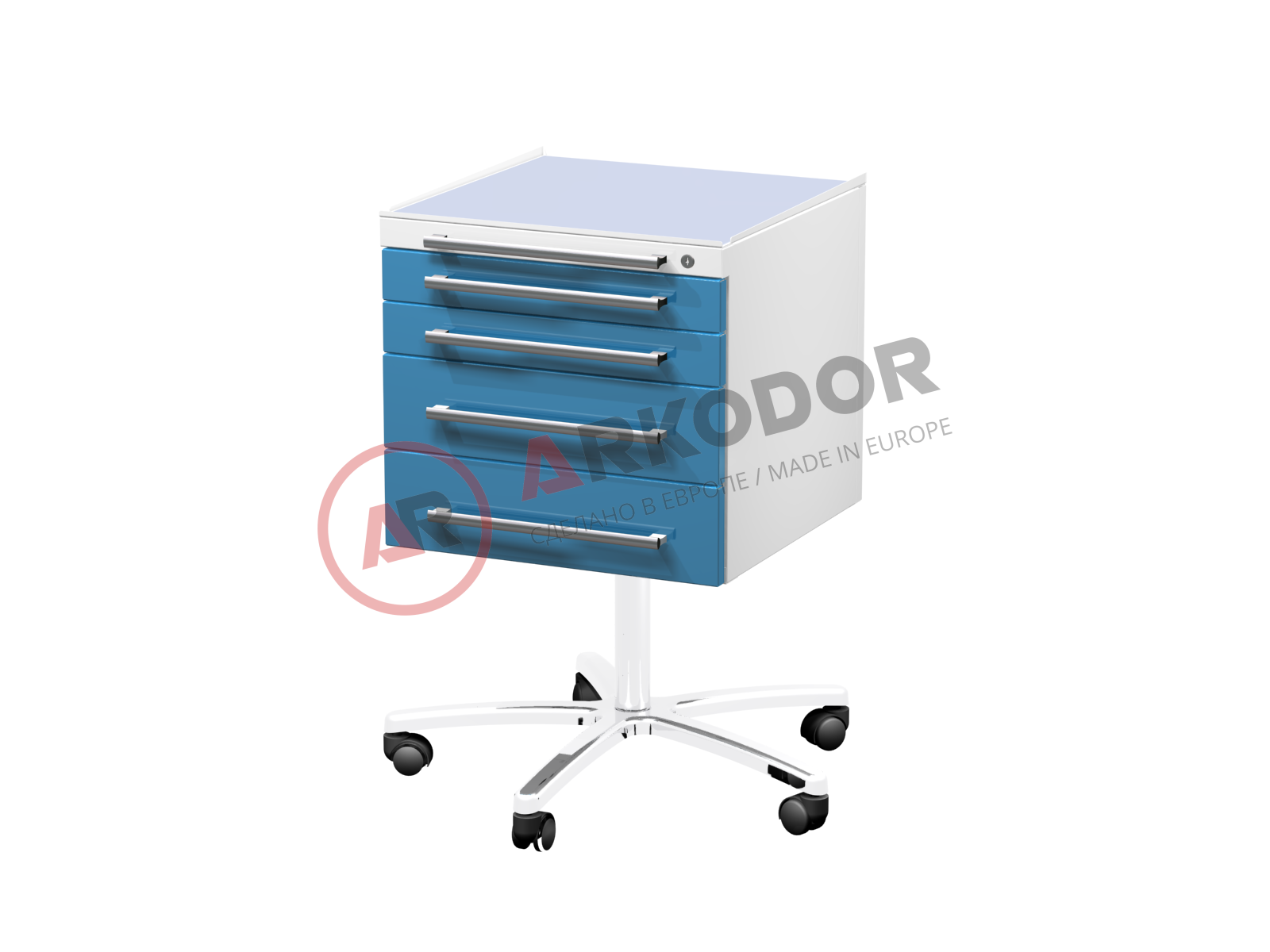 Мобильный столик врача (ассистер) AR-34.3 LUX с четырьмя выдвижными ящиками – это удобный и практичный мебельный элемент для медицинских кабинетов. Он позволяет разместить на рабочей поверхности различные инструменты, материалы и оборудование, а также хранить их в закрытых ящиках. Столик изготовлен из стали с полимерным покрытием, что обеспечивает его прочность и гигиеничность. Столешница покрыта стеклом, которое легко чистить и дезинфицировать. Столик оснащен колесами, которые облегчают его перемещение по кабинету. Высота столика регулируется при помощи газ-лифта в диапазоне от 720 до 850 мм. Опорное основание имеет диаметр 600 мм. Столик может комплектоваться замками, лотками и розетками по желанию заказчика. Столик подходит для разных сфер медицины, таких как стоматология, хирургия, гинекология, кардиология и другие .