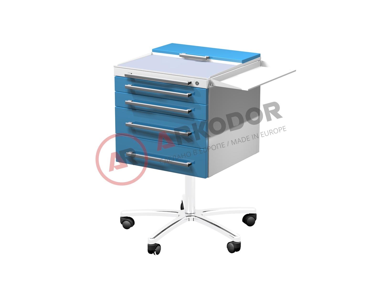 Столик AR-34.3M LUX – это мобильный помощник врача, который имеет четыре ящика для хранения медицинских принадлежностей. Столешница из стекла удобна для работы с инструментами и оборудованием. Столик легко передвигать по кабинету благодаря колесам. Высота столика может меняться от 720 до 850 мм с помощью газ-лифта. Опорное основание столика имеет диаметр 600 мм. Столик может быть дополнен замками, лотками и розетками по запросу клиента. Столик подходит для различных областей медицины, таких как стоматология, хирургия, гинекология, кардиология и другие.