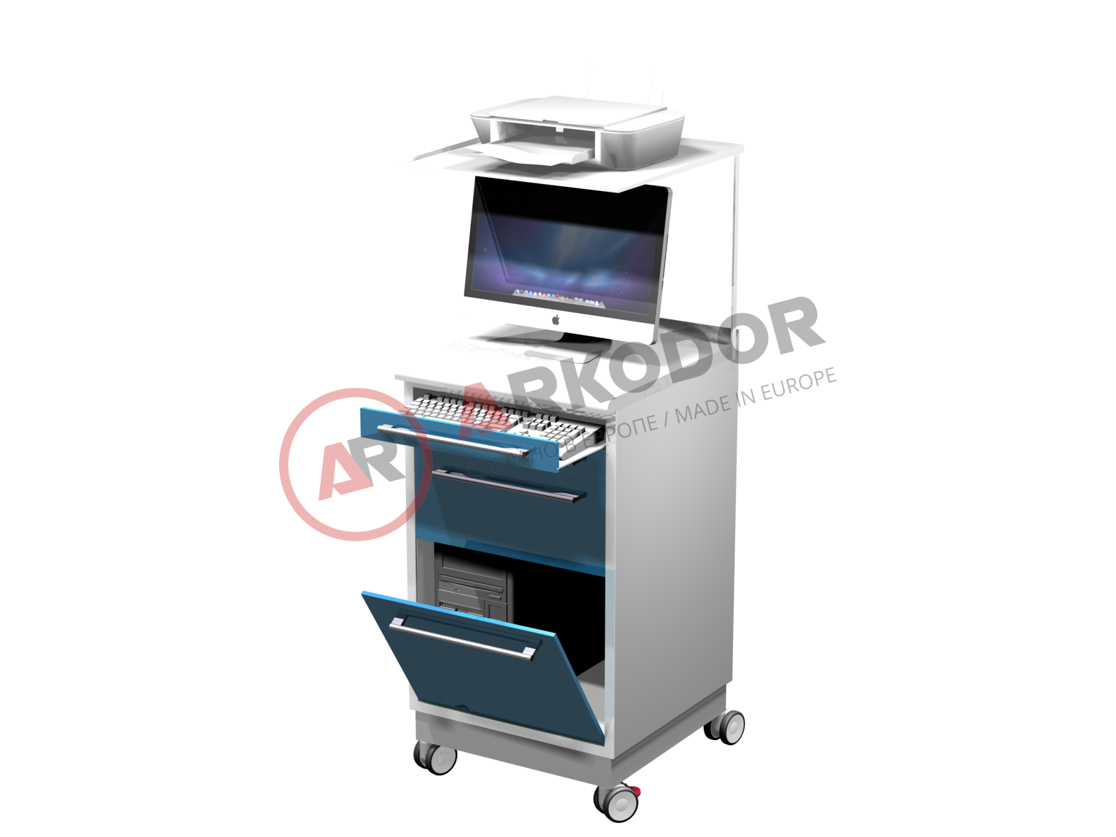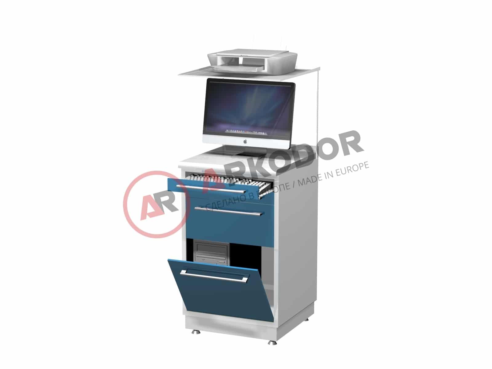Металлическая тумба AR-K24 предназначена для размещения компьютера или любой медицинской техники. Она имеет два выдвижных ящика для хранения документов и аксессуаров, а также откидную дверь, за которой можно спрятать провода и блок питания. Размеры тумбы составляют 1400 х 500 х 600 мм. Металлический корпус выполнен из прочного материала и покрыт эпоксидно-полиэфирной порошковой краской, которая защищает от коррозии и царапин. По желанию заказчика тумба может быть оснащена большими двойными колесами фирмы TENTE (Германия), которые обеспечивают легкость и удобство перемещения тумбы по помещению.
