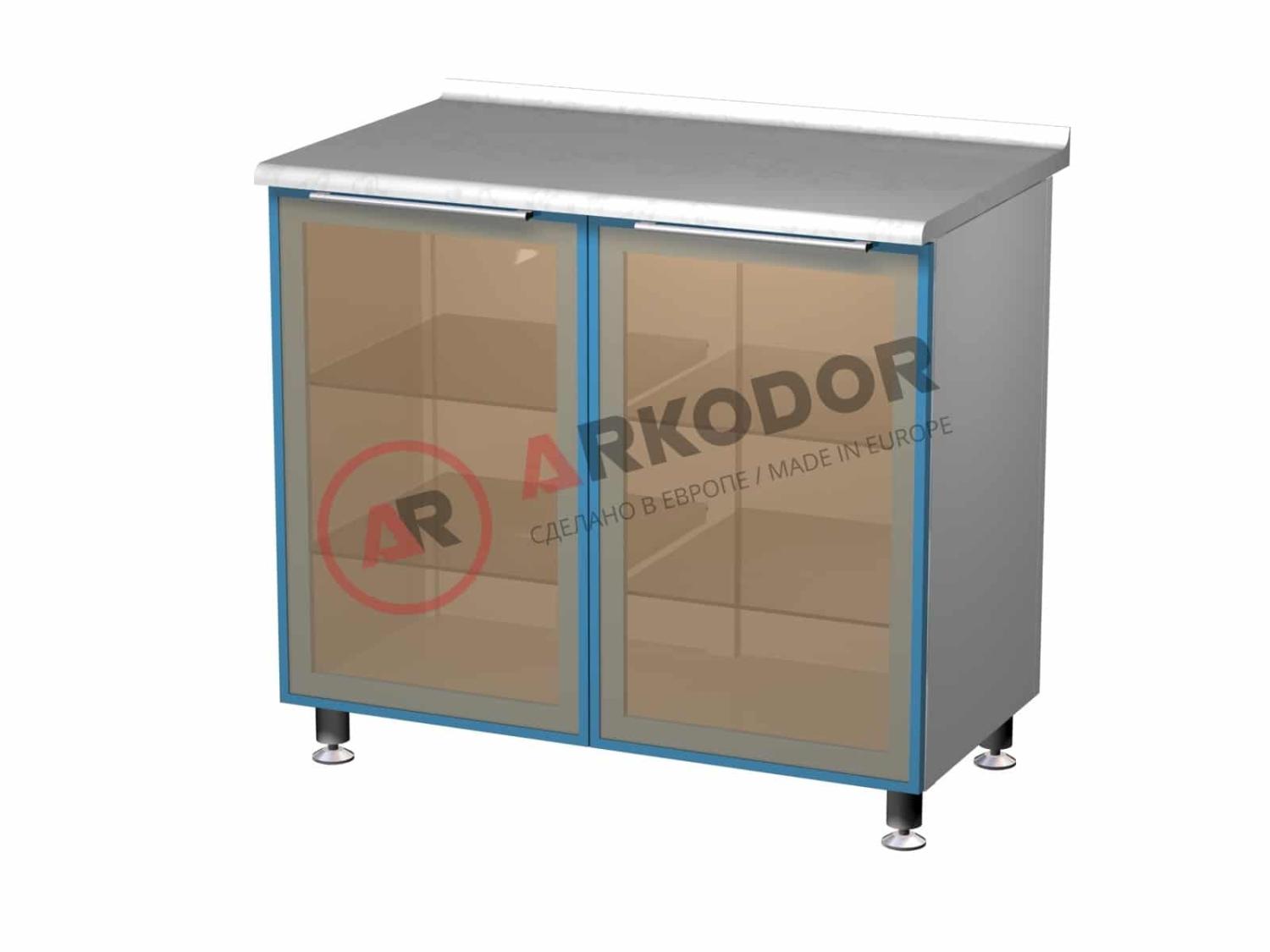 Металлическая тумба с двумя распашными застекленными дверями и четырьмя стеклянными полками, в880 х ш1000 х г600мм