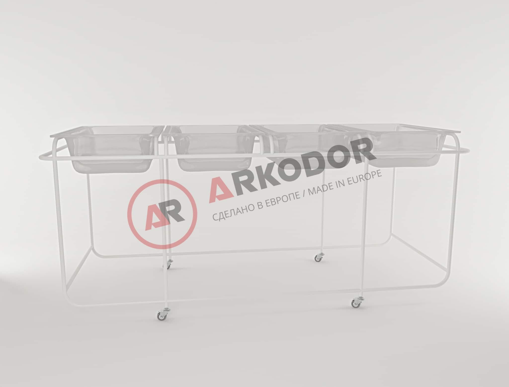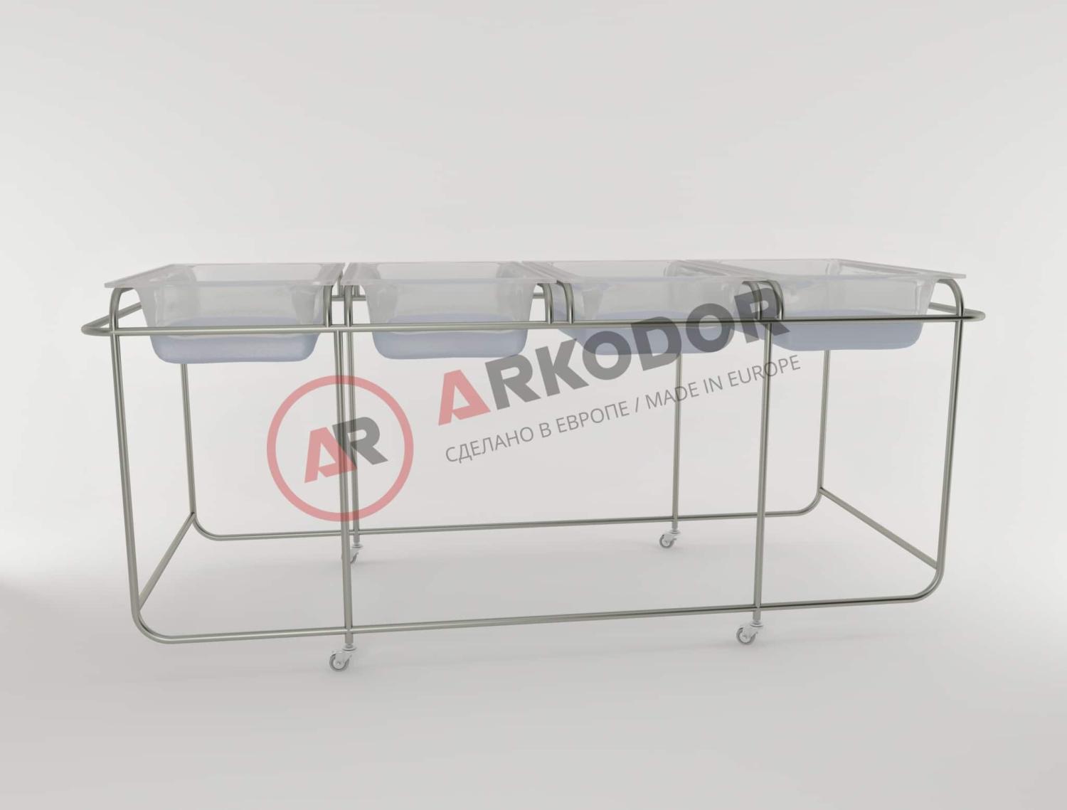 Нержавеющая сталь , 4 кювеза из акрила толщиной 6 мм; 4 матраца с наматрацником из кожзаменителя медицинской серии; допустимая нагрузка на кювез – 12 кг; 4 колеса ø7 5 мм ( 2 с тормозом), ДхШхВ, мм – 2080х800х850