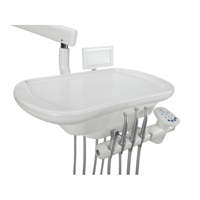 Большой столик с нижним подводом инструментов и сенсорным блоком управления. Предусмотрены: регулировка давления воды и воздуха, автоматический отделитель влаги, два крана для подключения компрессора, а также система «АнтиСПИД-антигепатит». Переключатель на влажный и сухой режимы располагается на ножной педали.