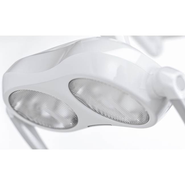 С креплением к стоматологической установке - 35 000 люкс света - 4900°K цветовой температуры; Установка интенсивности освещения (8000 - 35000 люкс). 3 оси вращения - плавное включение осветителя с автоматическим нарастанием интенсивности освещения. Легкая очистка защитного экрана. Съемные и стерилизуемые ручки.