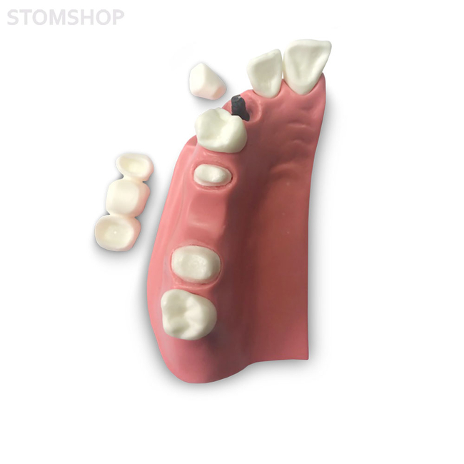 Модель верхней челюсти для демонстрации установки мостика из 3 элементов и импланта. Один зуб отсутствует, соседние зубы подготовлены к установке моста. Вместо клыка установлен имплант.