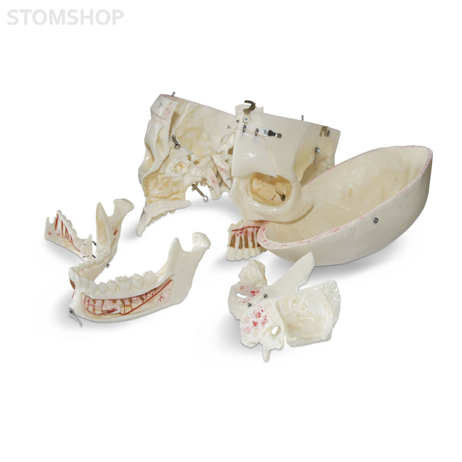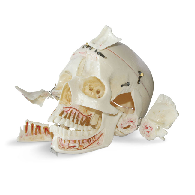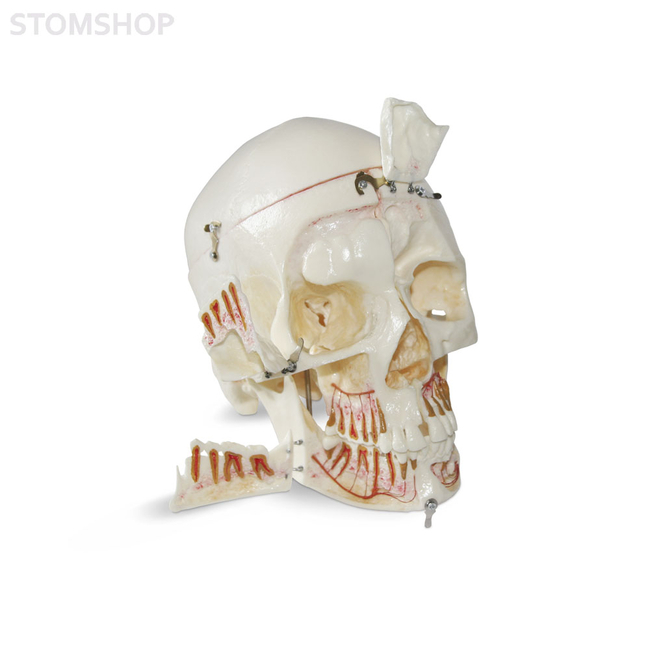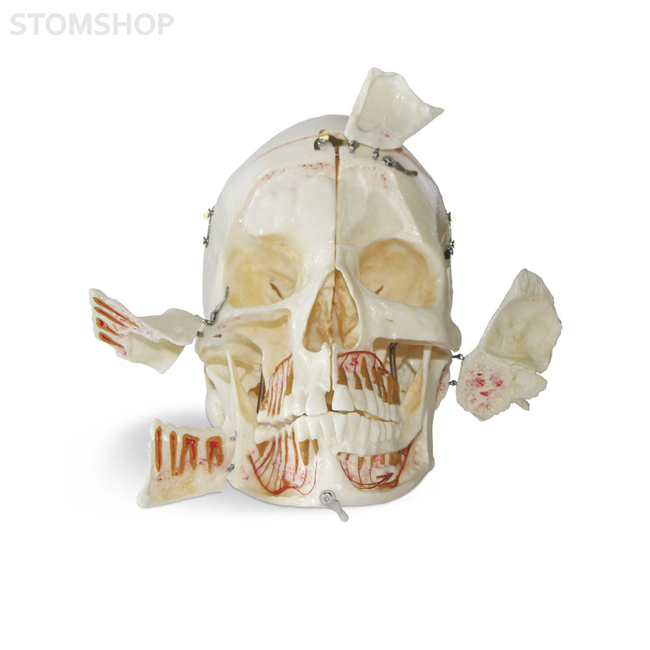 Полноразмерная демонстрационная модель черепа, точно показывающая анатомию черепа. Разделена на 10 частей. Выделены все кости лицевого и мозгового отделов. Модель реалистично воспроизводит строение верхней и нижней челюстей с их картикальной пластинкой, губчатым веществом, топографией верхнечелюстного нерва, имитирует строение зубов с их коронковой и корневой частью и сосудисто-нервным пучком.