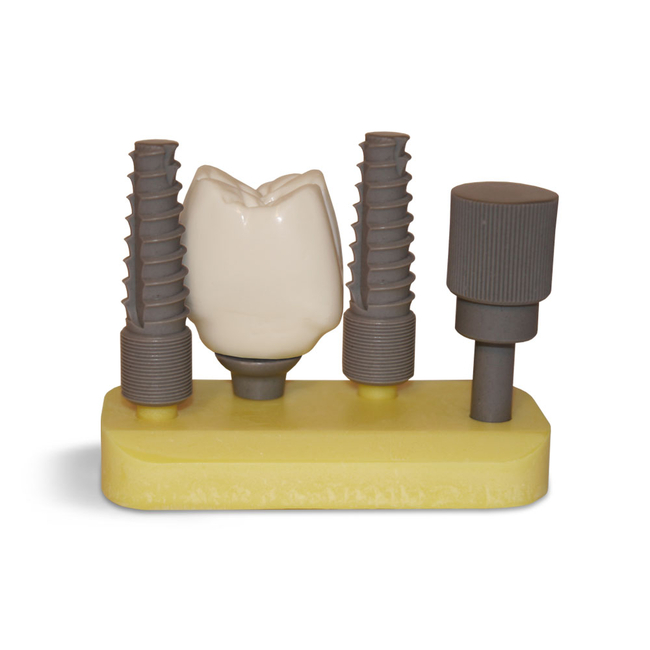 Увеличенная демонстрационная модель импланта, высотой 9 сантиметров. Абатмент, коронка с основанием, винт и ключ на подставке.