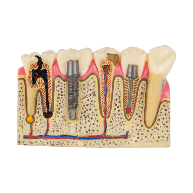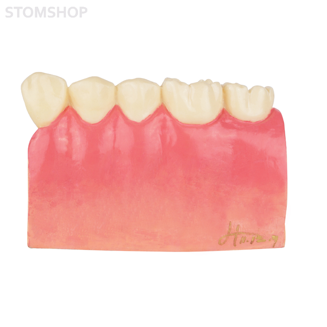 На модели показаны: здоровый зуб, имплантат, золотая инкрустация зуба, коронка, кариес. Размеры (ДхВ): 140 х 95 мм.
