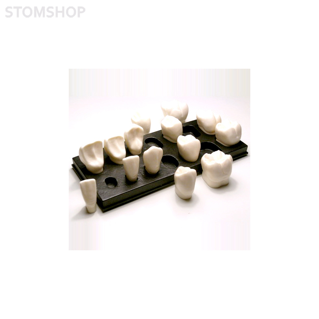 7 коронок верхних зубов и 7 коронок нижних зубов, в масштабе 5:1 на подставке. Необходимы зубным техникам на этапе моделирования коронок, а также терапевтам при создании эстетической реставрации. Форма зубов точно повторяет анатомическое строение естественных зубов.