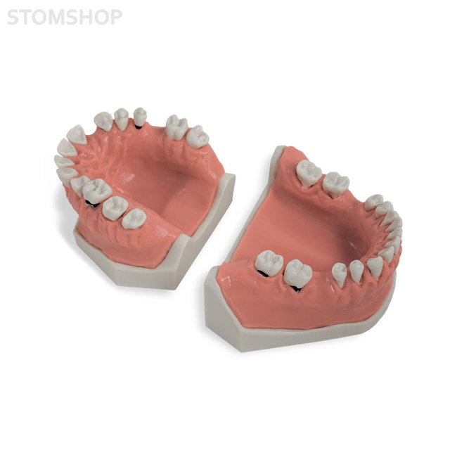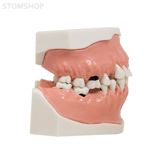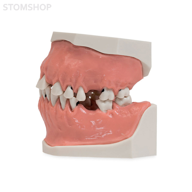 Модель демонстрирует заболевания пародонта на разных стадиях процесса. Зубы незаменяемые, выполнены из прочного материала для работы ручными инструментами и ультразвуком. Представлены различные варианты кариозного поражения твердых тканей зуба.
