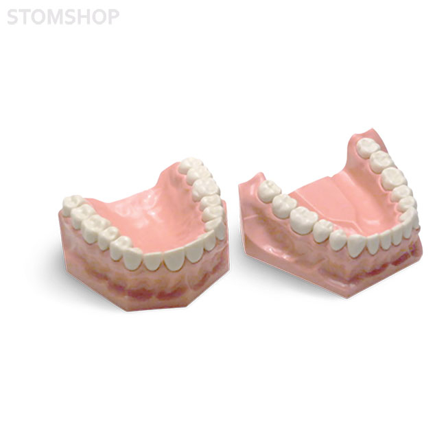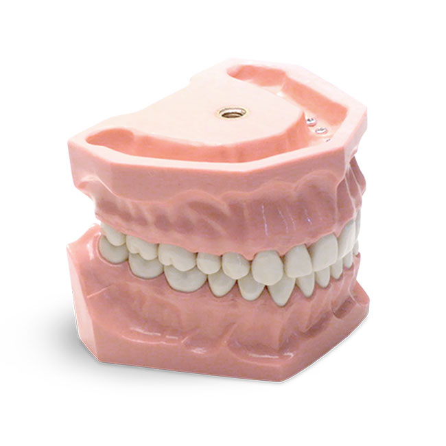Модель верхней и нижней челюсти для практики, точно имитирующая зубочелюстной аппарат взрослого человека. 32 зуба из материала Ivorine прикреплены к жесткой десне винтовой системой. Подходит для использования в артикуляторах и фантомных головах.