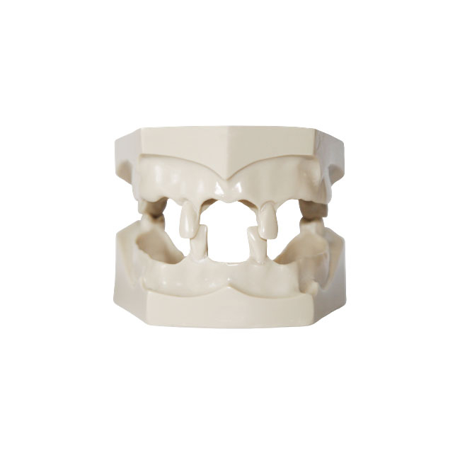 На верхней челюсти сохранены 12, 22, 17, 27 зубы, на нижней челюсти 32, 42, 37, 47 зубы. Все остальные зубы свободно устанавливаются в специально подготовленное для них ложе при помощи зуботехнического воска. Зубы могут занимать как правильное положение в зубной дуге, так и располагаться произвольно, то есть воспроизводить аномалии положения. В модели могут быть использованы естественные обработанные зубы, искусственные зубы (приобретаются отдельно). Модель устанавливается в фантомную голову GF-Dental либо других производителей, либо в артикулятор. Актуальна для терапевтов, ортодонтов.