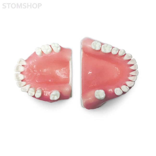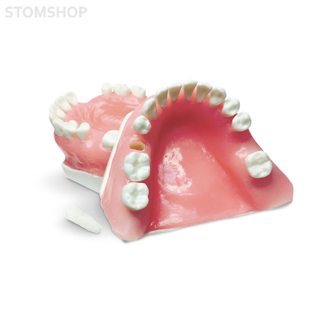 Модель верхней и нижней челюсти с частичным отсутствием зубов для хирургической и имплантологической практики. На нижней челюсти нет 46 зуба, на верхней 16, 23, 24. Десна розовая, эластичная, заменяемая, позволяет делать разрезы, накладывать швы. Модель изготовлена из материала соответствующего по плотности естественной кости. Все зубы адаптированы для освоения навыка экстракции. Импланты могут быть установлены как в проекции отсутствующих зубов, так и в лунку после удаления.