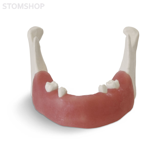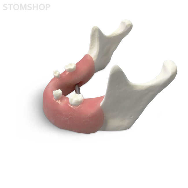 Модель нижней челюсти для практики имплантации. Состоит из материала, имитирующего по плотности естественную кость. Альвеолярный гребень равномерно выражен, сохранены 34, 44, 36, 46 зубы. Модель имеет заменяемую мягкую, податливую десну, которая подходит для наложения швов.