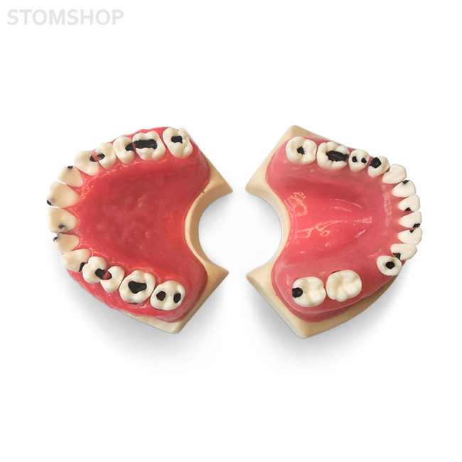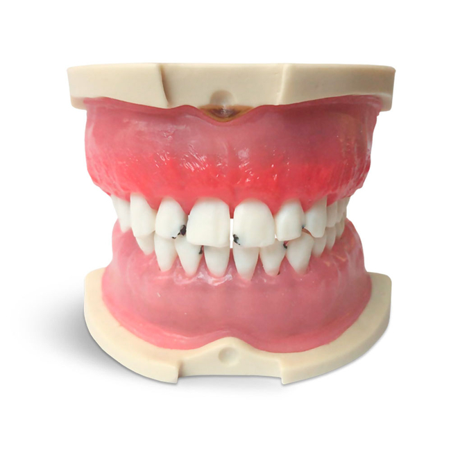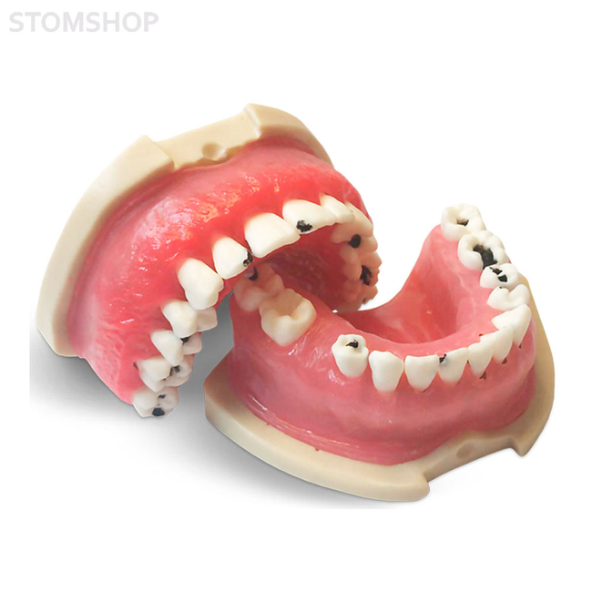 Модель верхней и нижней челюсти с пародонтопатологией для практики, десна эластичная, заменяемая. Зубы съемные, с кариесом и зубной бляшкой. Десна мягкая, розовая, заменяемая. Подходит для использования в фантомных головах, артикуляторах и на подставке.